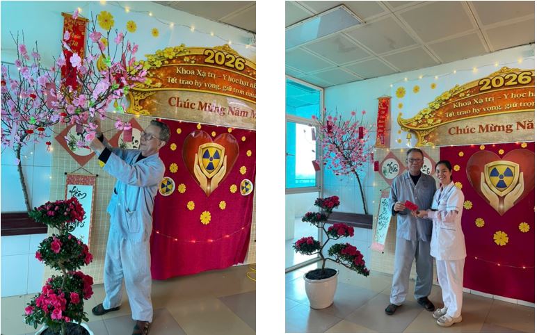 Xuân không chỉ hiện diện ở sắc đào, sắc mai, mà còn trong sự tận tâm của đội ngũ y bác sỹ khoa Xạ trị & Y học hạt nhân, trong từng quy trình điều trị an toàn, chính xác và trong những lời chúc yêu thương còn lưu lại nơi cành đào đậm sắc xuân.
