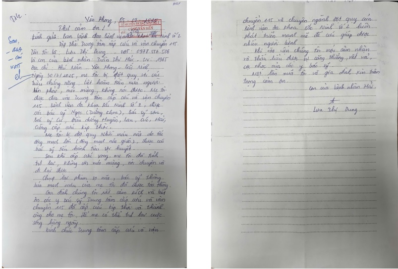 LÁ THƯ CẢM ƠN XÚC ĐỘNG GỬI TRUNG TÂM CẤP CỨU 115