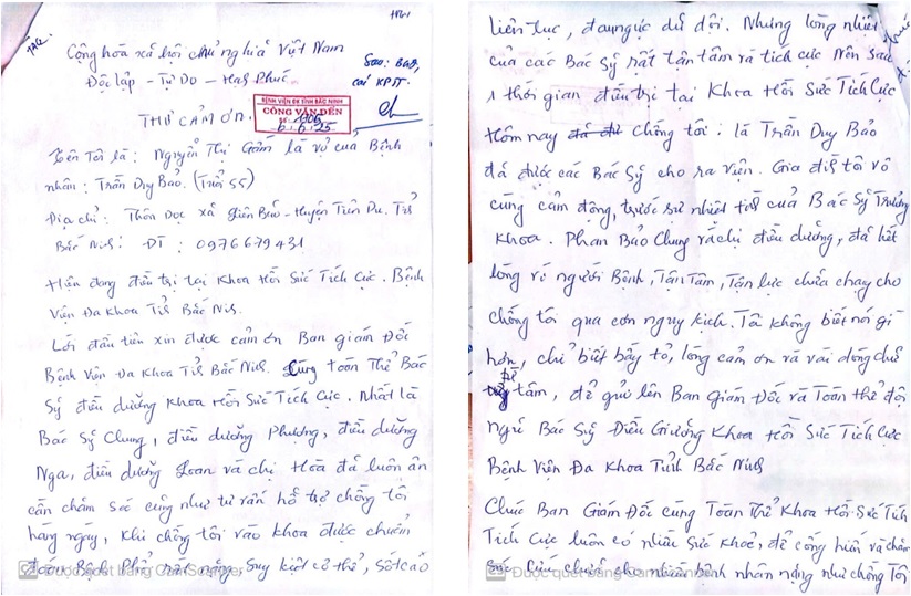 Trong tuần qua, Bệnh viện Đa khoa tỉnh Bắc Ninh đã nhận được một bức thư đặc biệt từ gia đình người bệnh gửi đến tập thể khoa Hồi sức tích cực. Lá thư không chỉ là lời tri ân chân thành mà còn là minh chứng sống động cho giá trị nhân văn sâu sắc mà người làm nghề y đang gìn giữ mỗi ngày.
