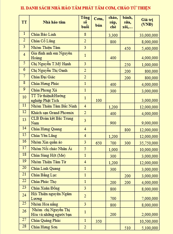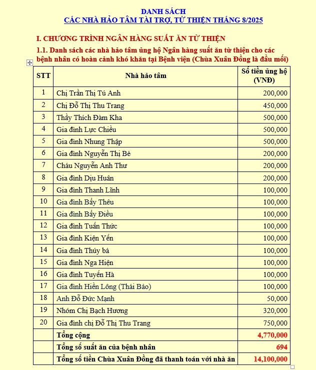 1. Chương trình Ngân hàng suất ăn từ thiện: Tổng số 33 lượt bệnh nhân có hoàn cảnh khó khăn đã được hỗ trợ 694 suất ăn tại Căng tin bệnh viện, tổng giá trị 14,100,000 đồng. Chùa Xuân Đồng là đầu mối tiếp nhận tài trợ từ 20 quý nhà hảo tâm với số tiền 4,770,000 đồng.