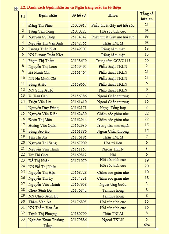 2. Giám sát, phối hợp phát suất ăn từ thiện: Phối hợp cùng 44 tổ chức từ thiện thực hiện 93 buổi phát cơm cháo từ thiện, gửi đến người bệnh 25.206 suất ăn miễn phí. Tổng giá trị ước đạt 313,032,000 đồng.
