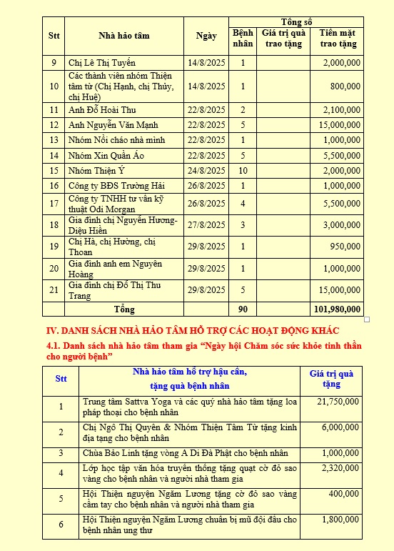 Trong tháng 8/2025, Phòng Công tác xã hội đã kết nối với các quý nhà hảo tâm thăm, động viên, trao tặng các suất ăn, suất quà miễn phí trực tiếp đến người bệnh đang điều trị tại bệnh viện, tổng giá trị ước đạt 493,108,000 đồng. Trong đó, các nhà hảo tâm trao tặng 116,080,000 đồng tiền mặt hỗ trợ các bệnh nhân có hoàn cảnh khó khăn tại Bệnh viện, cụ thể như sau: