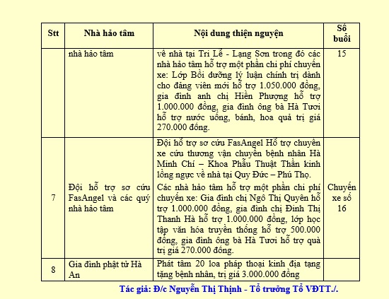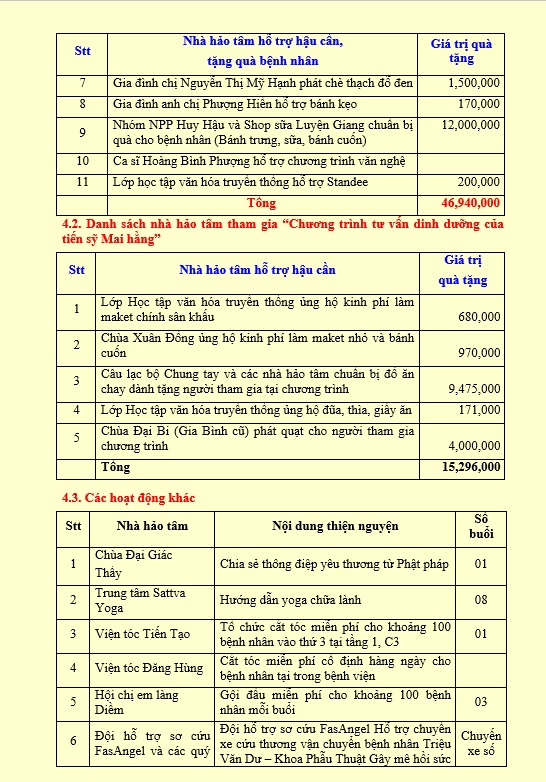 4. Các hoạt động khác: Đội hỗ trợ sơ cứu FasAngel và các quý nhà hảo tâm Hỗ trợ chuyến xe cứu thương vận chuyển bệnh nhân: Bệnh nhân Triệu Văn Dư – Khoa Phẫu Thuật Gây mê hồi sức về nhà tại Tri Lễ - Lạng Sơn, các nhà hảo tâm hỗ trợ một phần chi phí chuyến xe với số tiền 2.320.000 đồng; đưa bệnh nhân Hà Minh Chí – Khoa Phẫu Thuật Thần kinh lồng ngực về nhà tại Quy Đức – Phú Thọ, các nhà hảo tâm hỗ trợ một phần chi phí chuyến xe với số tiền 2.770.000 đồng. Tổ chức chương trình Ngày hội chăm sóc sức khỏe tinh thần cho người bệnh tại Hội trường 1, tầng 7 – C3, giá trị ước đạt 49.940.000 đồng; Tổ chức chương trình tư vấn dinh dưỡng do tiến sỹ Mai Hằng chia sẻ và tiệc Buffet chay cho nhân viên bệnh viện cùng các quý nhà hảo tâm, giá trị ước đạt 15.296.000 đồng. Gia đình phật tử Hà An phát tâm 20 loa pháp thoại trị giá 3.000.000 đồng. Tổ chức chương trình cắt tóc miễn phí cho bệnh nhân vào chiều thứ 3 hàng tuần. Tổ chức chương trình “Chia sẻ thông điệp yêu thương từ Phật pháp” chiều thứ 5 hàng tuần. Tổ chức lớp hướng dẫn yoga chữa lành chiều thứ 2 và thứ 4 hàng tuần. Duy trì Tủ đọc sách báo miễn phí.