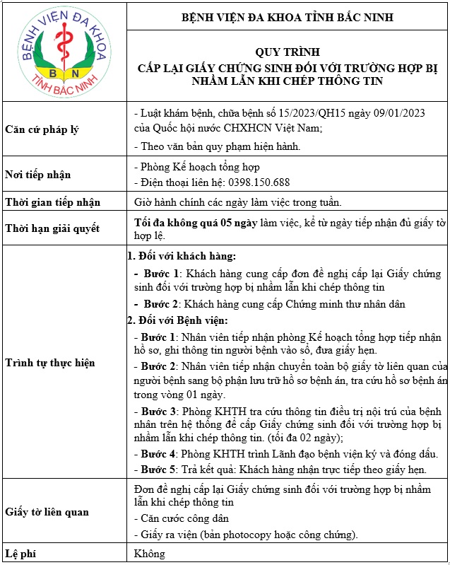 QUY TRÌNH CẤP LẠI GIẤY CHỨNG SINH ĐỐI VỚI TRƯỜNG HỢP BỊ NHẦM LẪN KHI CHÉP THÔNG TIN