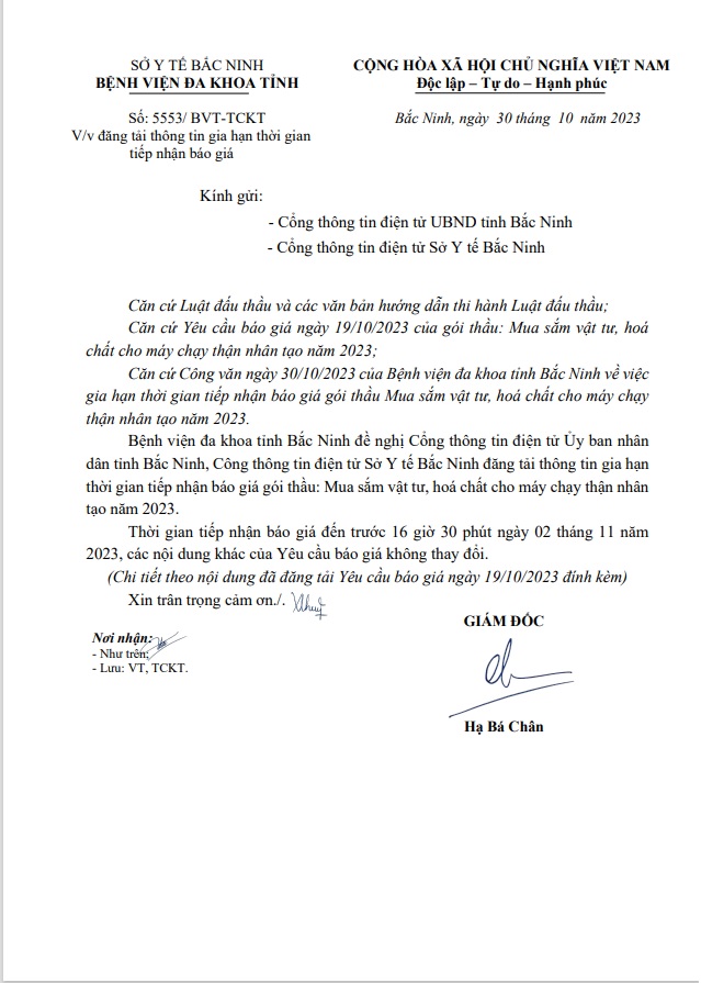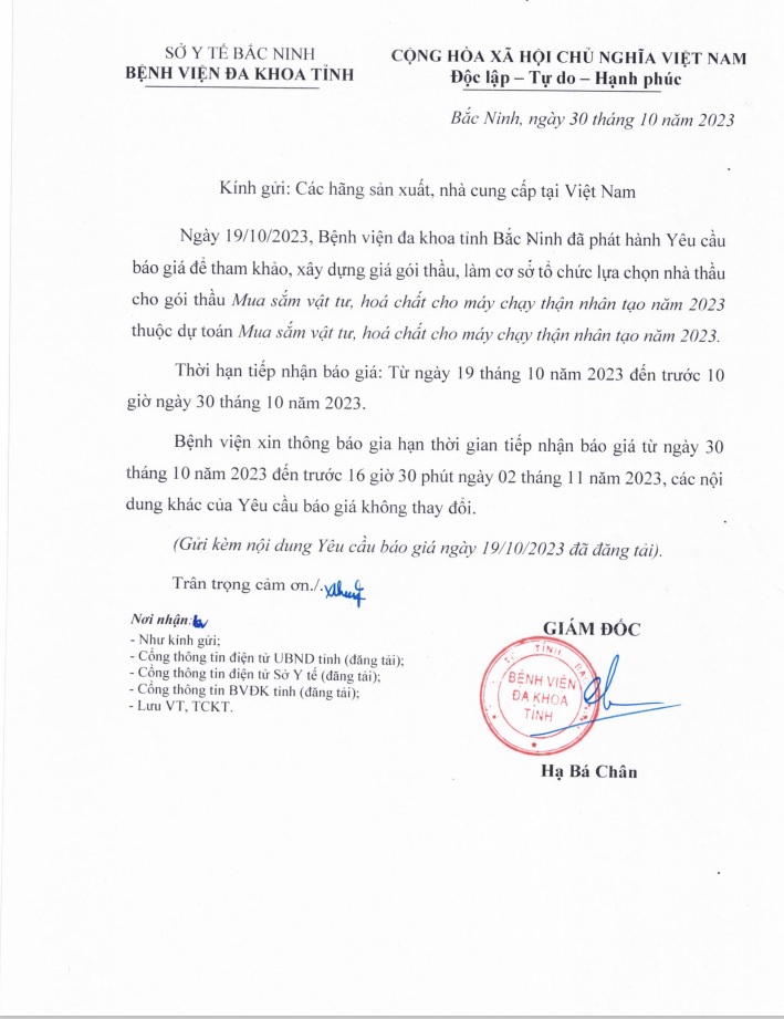 Bệnh viện đa khoa tỉnh Bắc Ninh gửi yêu cầu về việc đăng tải thông tin gia hạn thời gian tiếp nhận báo giá gói thầu: Mua sắm vật tư, hoá chất cho máy chạy thận nhân tạo năm 2023