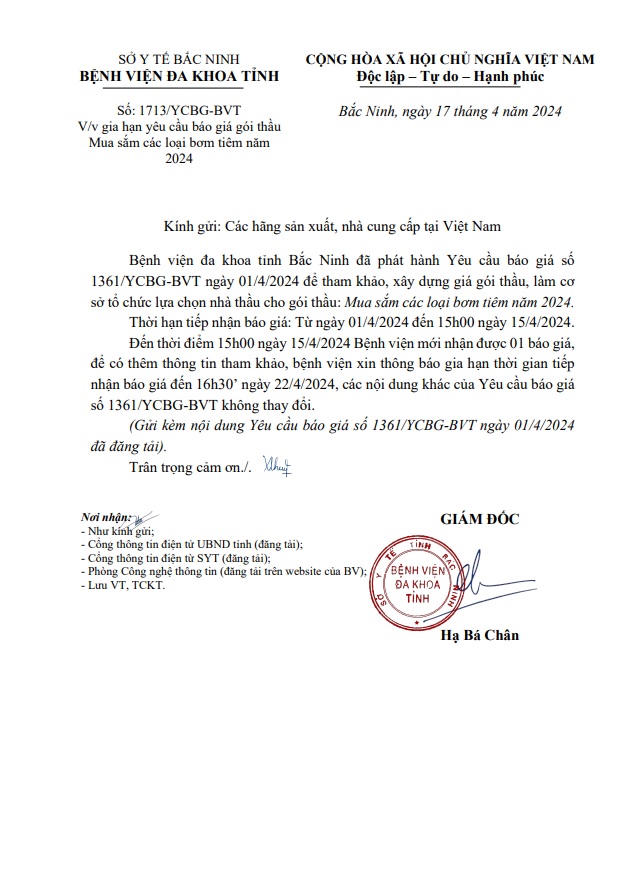 Công văn gia hạn yêu cầu báo giá gói thầu Mua sắm các loại bơm tiêm năm 2024