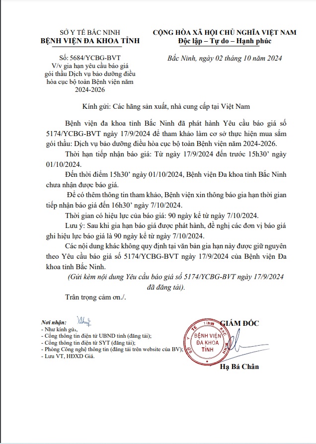 Gia hạn yêu cầu báo giá gói thầu Dịch vụ bảo dưỡng điều hoà cục bộ toàn Bệnh viện năm 2024-2026