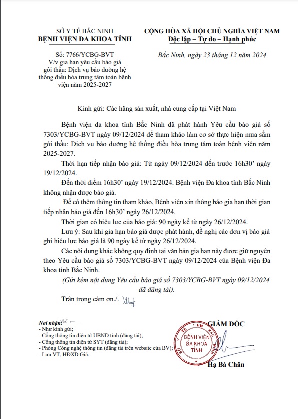 Gia hạn yêu cầu báo giá gói thầu: Dịch vụ bảo dưỡng hệ thống điều hoà trung tâm toàn Bệnh viện năm 2025-2027