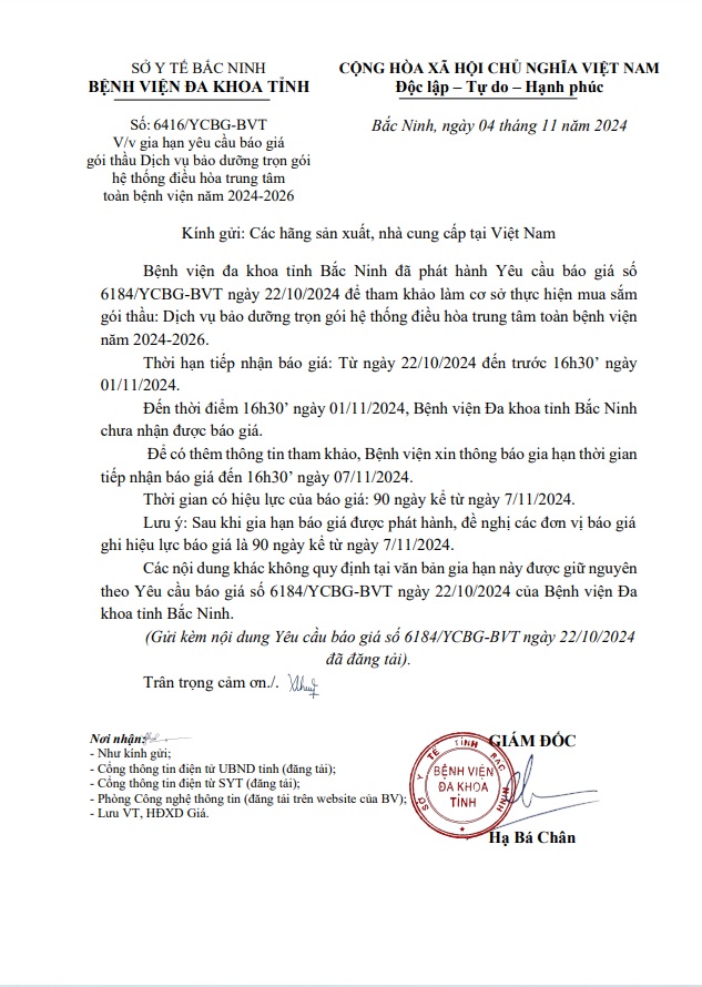 V/v gia hạn yêu cầu báo giá gói thầu Mua sắm vật tư, hóa chất xét nghiệm Real time PCR năm 2024-2025