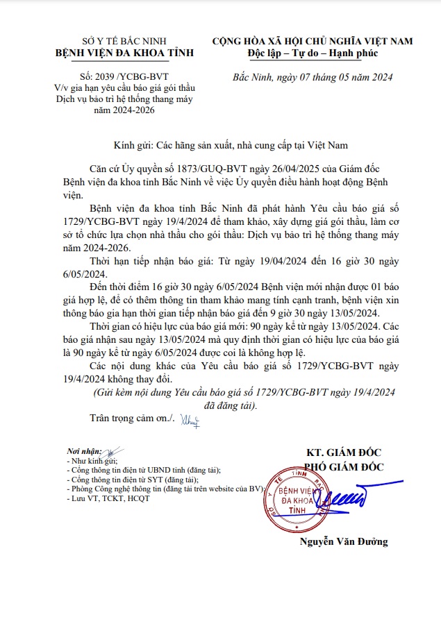 Gia hạn yêu cầu báo giá gói thầu Dịch vụ bảo trì hệ thống thang máy năm 2024-2023