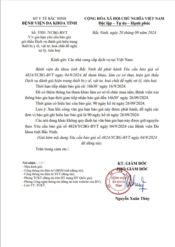 Gia hạn yêu cầu báo giá gói thầu Dịch vụ đánh giá hiện trạng thiết bị y tế, vật tư, hoá chất đề nghị xử lý, tiêu huỷ