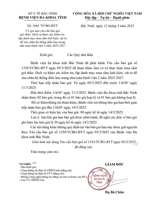 Gia hạn yêu cầu báo giá gói thầu: Dịch vụ khảo sát, kiểm tra, lập danh mục mua sắm linh kiện, vật tư để sửa chữa hệ thống điều hòa trung tâm toàn bệnh viện 2 năm 2025-2027