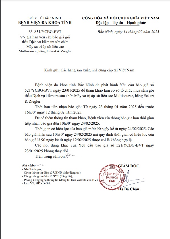 Gia hạn yêu cầu báo giá gói thầu Dịch vụ kiểm tra sửa chữa Máy xạ trị áp sát liều cao Multisource, hãng Eckert & Ziegler