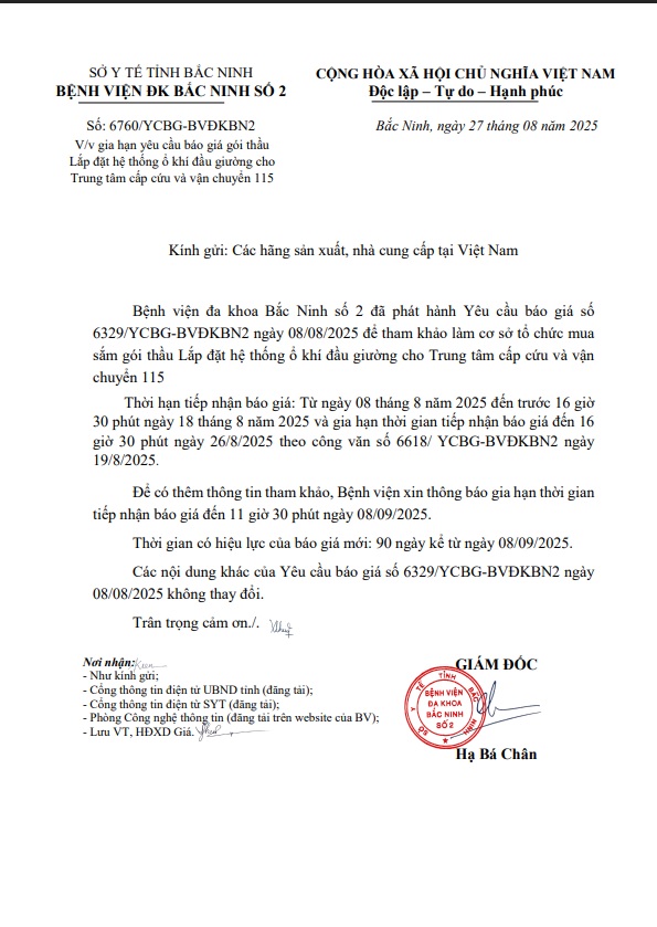 Gia hạn yêu cầu báo giá gói thầu Lắp đặt hệ thống ổ khí đầu giường cho Trung tâm cấp cứu và vận chuyển 115