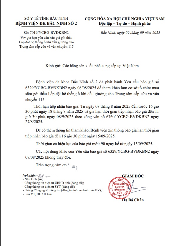 Gia hạn yêu cầu báo giá gói thầu Lắp đặt hệ thống ổ khí đầu giường cho Trung tâm cấp cứu và vận chuyển 115