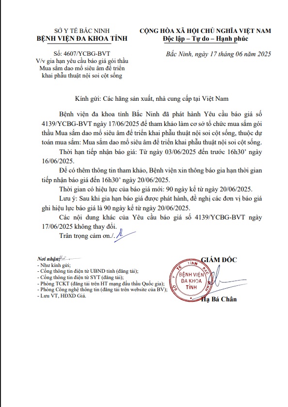 Gia hạn yêu cầu báo giá gói thầu Mua sắm dao mổ siêu âm để triển khai phẫu thuật nội soi cột sống