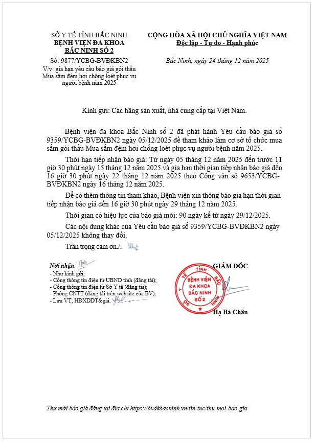 Gia hạn yêu cầu báo giá gói thầu Mua sắm đệm hơi chống loét phục vụ người bệnh năm 2025