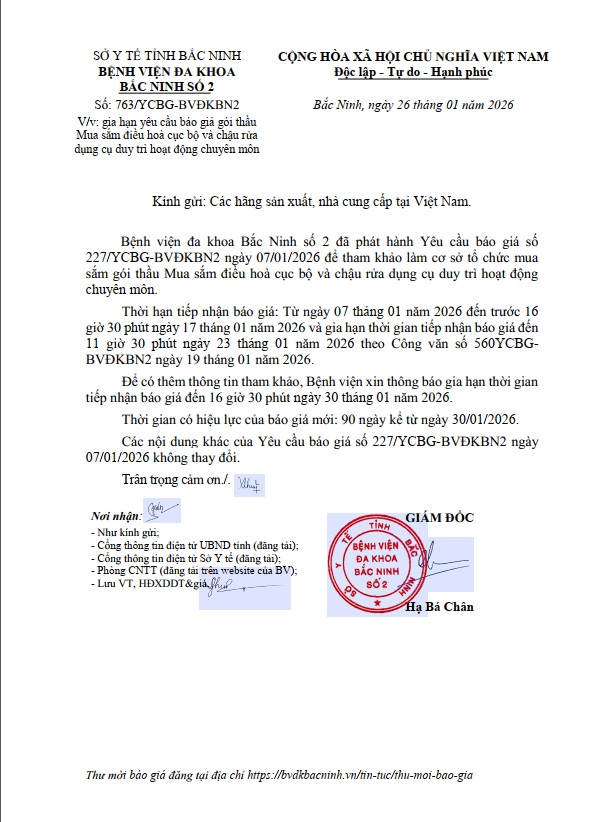 Gia hạn yêu cầu báo giá gói thầu Mua sắm điều hoà cục bộ và chậu rửa dụng cụ duy trì hoạt động chuyên môn