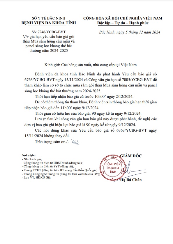Gia hạn yêu cầu báo giá gói thầu Mua sắm hồng cầu mẫu và panel sàng lọc kháng thể bất thường năm 2024-2025