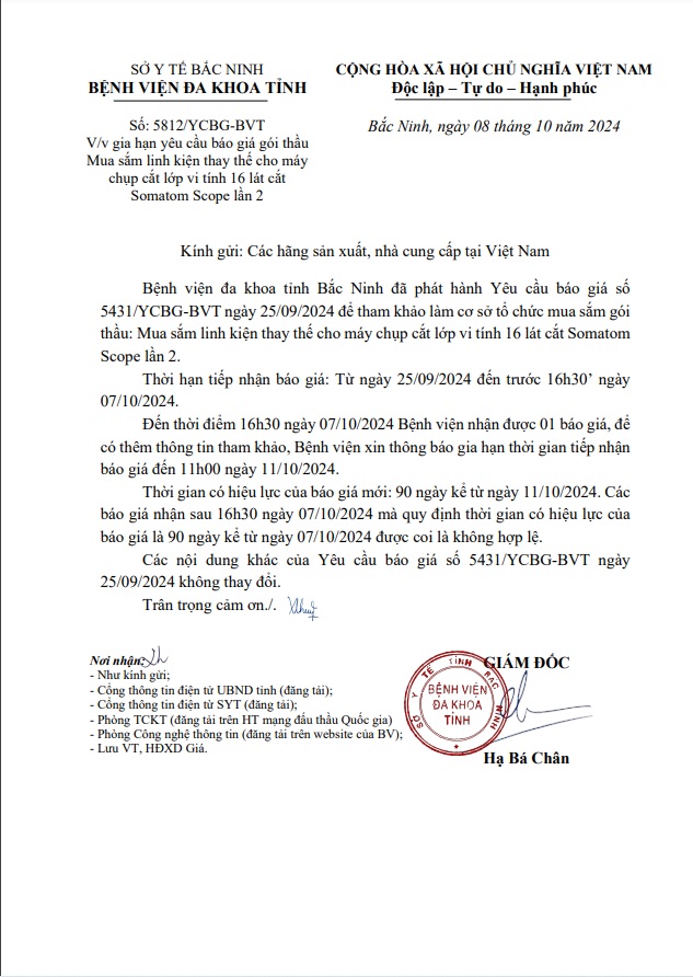 Gia hạn yêu cầu báo giá gói thầu Mua sắm linh kiện thay thế cho máy chụp cắt lớp vi tính 16 lát cắt Sornatom Scope lần 2