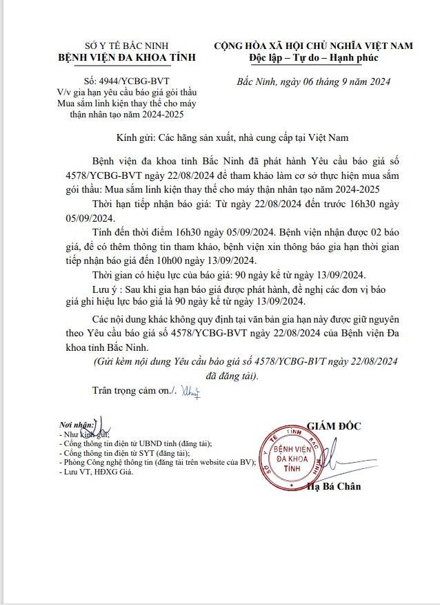 Gia hạn yêu cầu báo giá gói thầu Mua sắm linh kiện thay thế cho máy thận nhân tạo năm 2024-2025