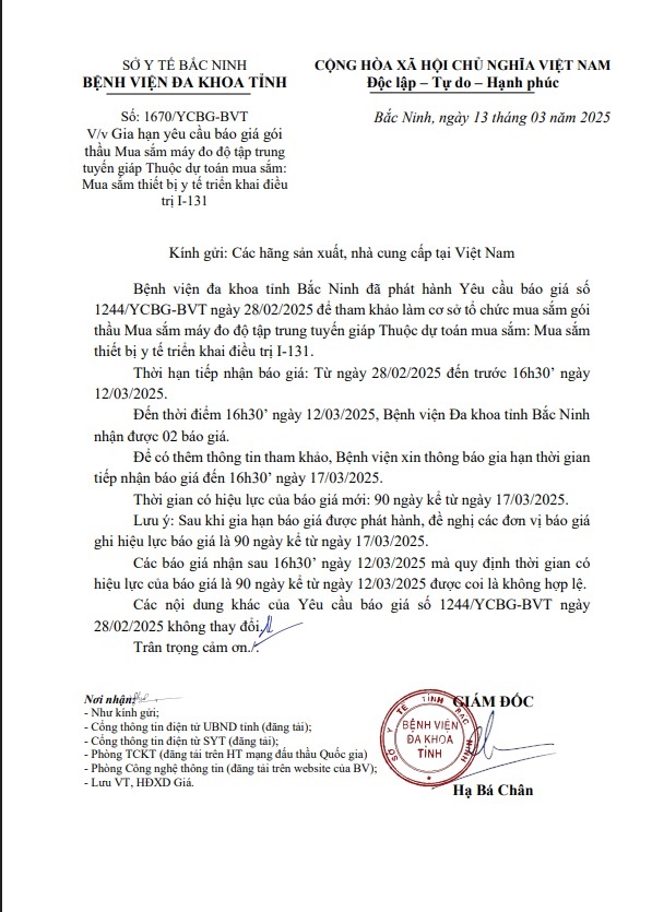 Gia hạn yêu cầu báo giá gói thầu Mua sắm máy đo độ tập trung tuyến giáp Thuộc dự toán mua sắm: Mua sắm thiết bị y tế triển khai điều trị I-131