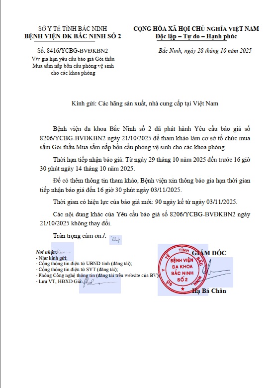 Gia hạn yêu cầu báo giá Gói thầu Mua sắm nắp bồn cầu phòng vệ sinh cho các khoa phòng