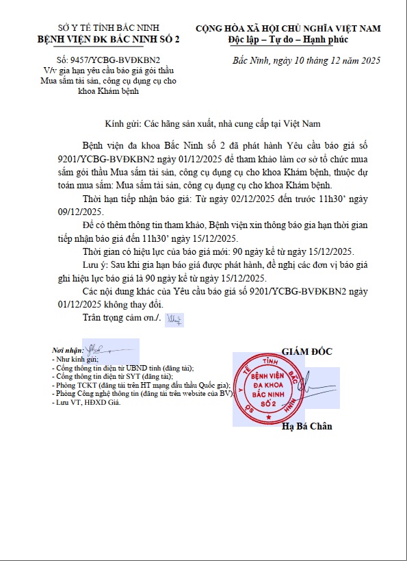Gia hạn yêu cầu báo giá gói thầu Mua sắm tài sản, công cụ dụng cụ cho khoa Khám bệnh