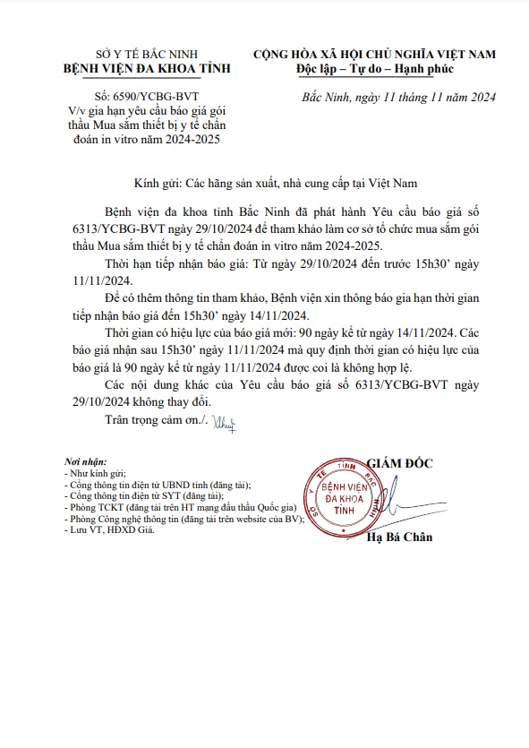 Gia hạn yêu cầu báo giá gói thầu Mua sắm thiết bị y tế chẩn đoán in vitro năm 2024-2025