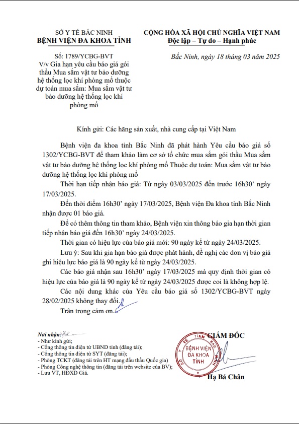 Gia hạn yêu cầu báo giá gói thầu Mua sắm vật tư bảo dưỡng hệ thống lọc khí phòng mổ thuộc dự toán mua sắm: Mua sắm vật tư bảo dưỡng hệ thống lọc khí phòng mổ