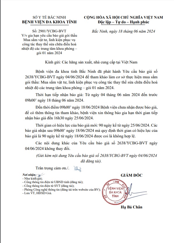 Gia hạn yêu cầu báo giá gói thầu Mua sắm vật tư, linh kiện phục vụ công tác thay thế sửa chữa điều hoà nhiệt độ các trung tâm khoa phòng - gói 01 năm 2024