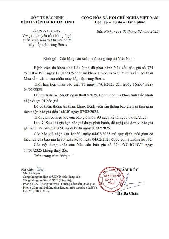 Gia hạn yêu cầu báo giá gói thầu Mua sắm vật tư sửa chữa máy hấp tiệt trùng Steris