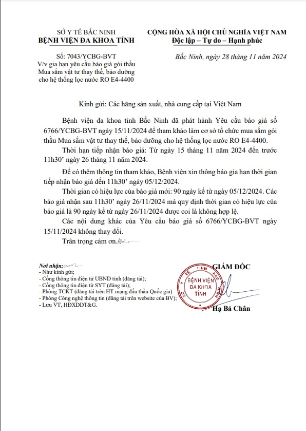 Gia hạn yêu cầu báo giá gói thầu Mua sắm vật tư thay thế, bảo dưỡng cho hệ thống lọc nước RO E4-4400