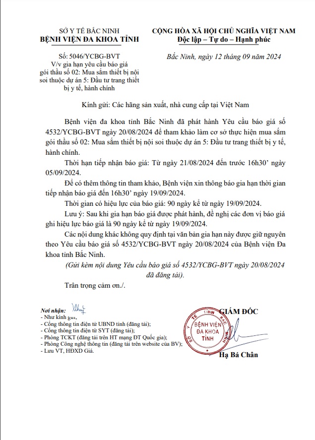 Gia hạn yêu cầu báo giá gói thầu số 02: Mua sắm thiết bị nội soi thuộc dự án 5: Đầu tư trang thiết bị nội soi thuộc dự án 5: Đầu tư trang thiết bị y tế, hành chính