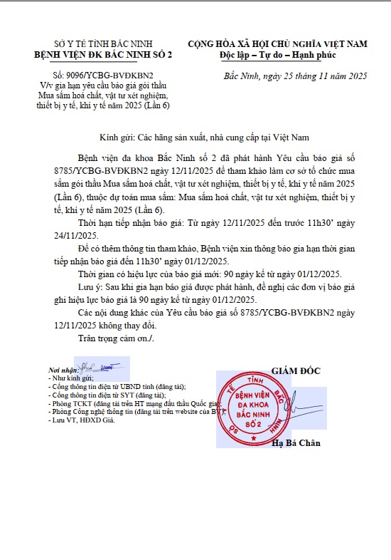 Gia hạn yêu cầu báo giá Mua sắm hoá chất, vật tư xét nghiệm, thiết bị y tế, khí y tế năm 2025 (Lần 6)