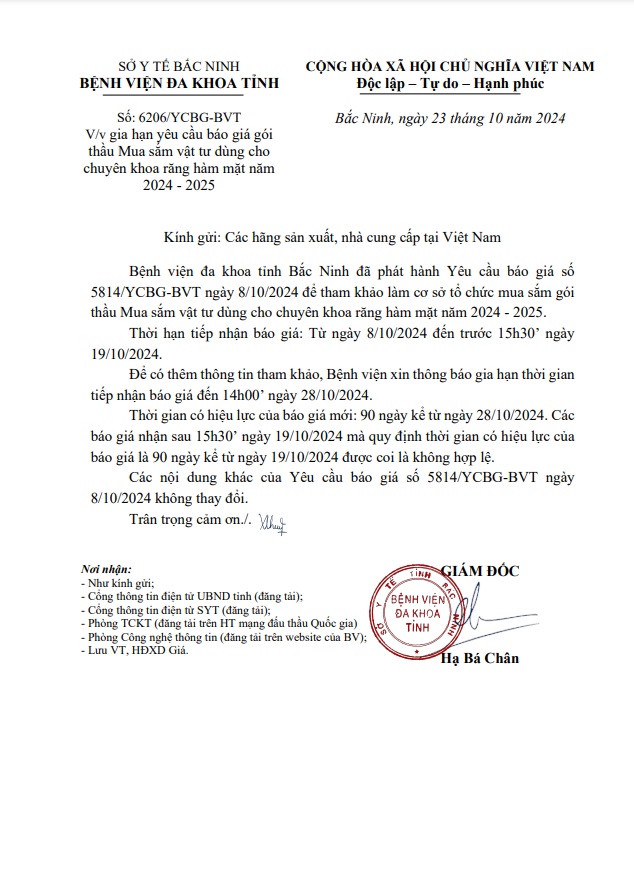 Gian hạn yêu cầu báo giá gói thầu Mua sắm vật tư dùng cho chuyên khoa răng hàm mặt năm 2024-2025