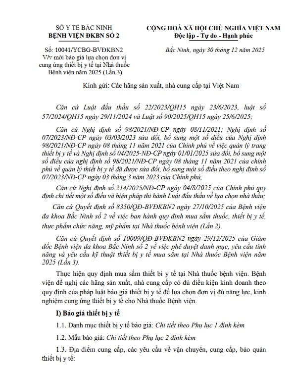 Mời báo giá lựa chọn đơn vị cung ứng thiết bị y tế tại Nhà thuốc Bệnh viện năm 2025 (Lần 3)