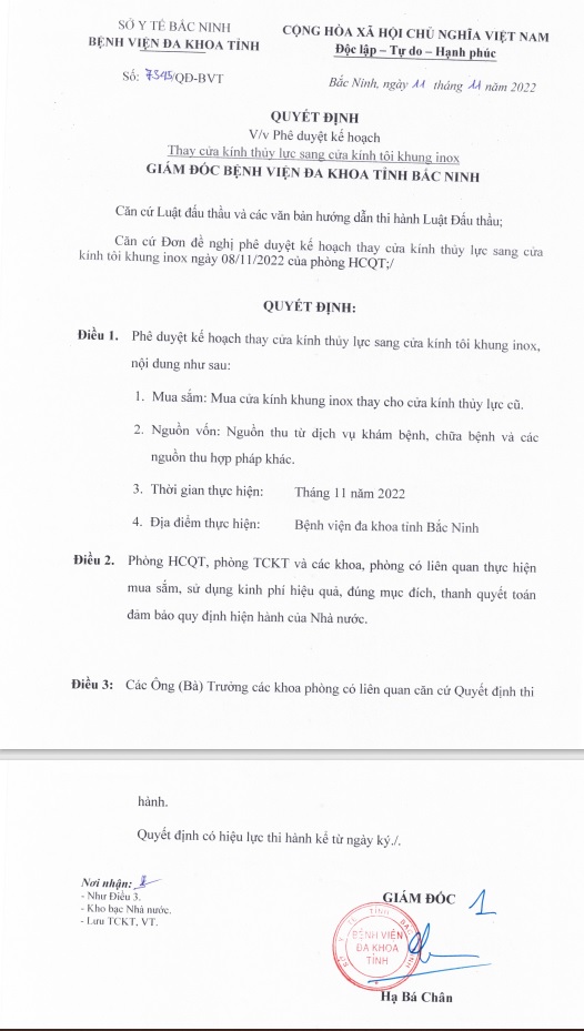 QUYẾT ĐỊNH V/v Phê duyệt kế hoạch Thau cửa kính thuỷ lực sang cửa kính tôi khung inox