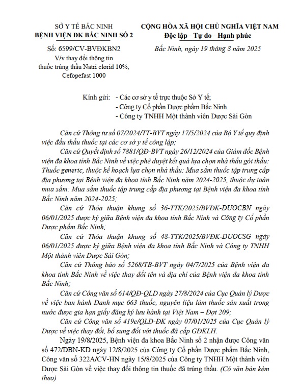 Thay đổi thông tin thuốc trúng thầu Natri clorid 10, Cefopefast 1000