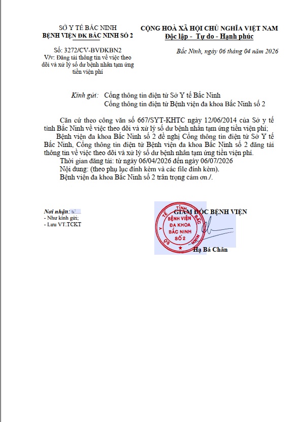 THÔNG BÁO CỦA BỆNH VIỆN ĐA KHOA BẮC NINH SỐ 2 Về việc tạm ứng, thanh toán viện phí