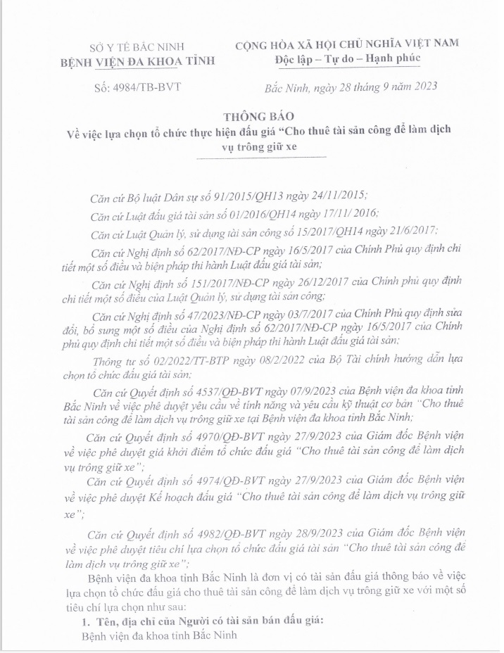 THÔNG BÁO Về việc lựa chọn tổ chức thực hiện đấu giá " Cho thuê tài sản công để làm dịch vụ trông giữ xe