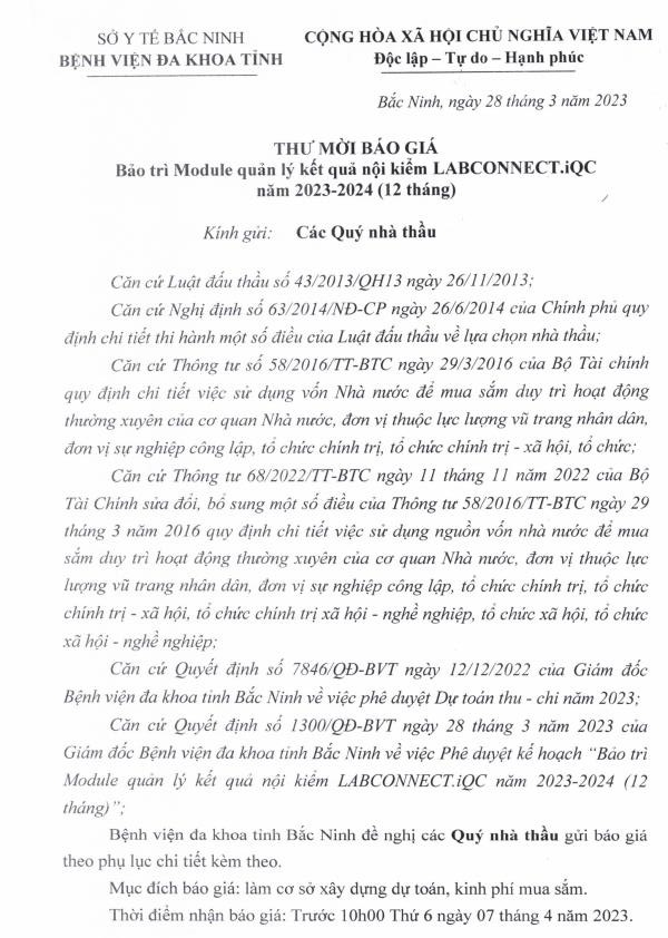 Thư mời báo giá Bảo trì Module quản lý kết quả nội kiểm LABCONNECT.iQC năm 2023-2024