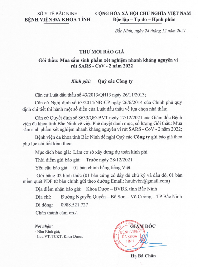THƯ MỜI BÁO GIÁ DANH MỤC SINH PHẨM XÉT NGHIỆM NHANH KHÁNG NGUYÊN VI RUT SARS- COVI-2 NĂM 2021