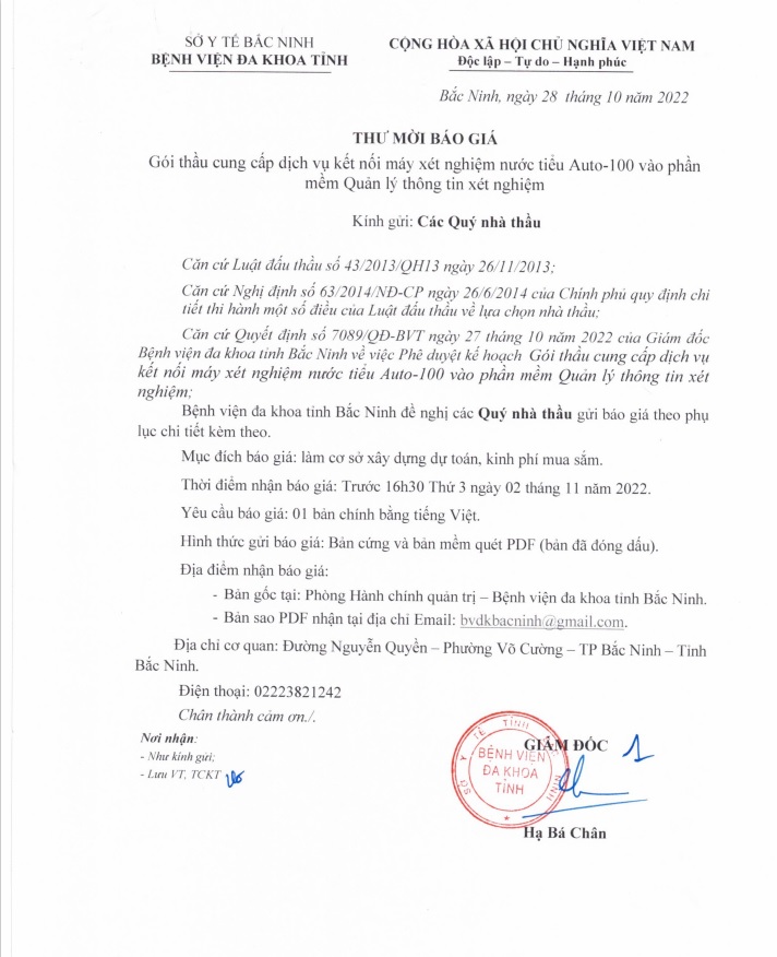 Thư mời báo giá Gói thầu cung cấp dịch vụ kết nối máy xét nghiệm nước tiểu Auto-100 vào phần mềm Quản lý thông tin xét nghiệm