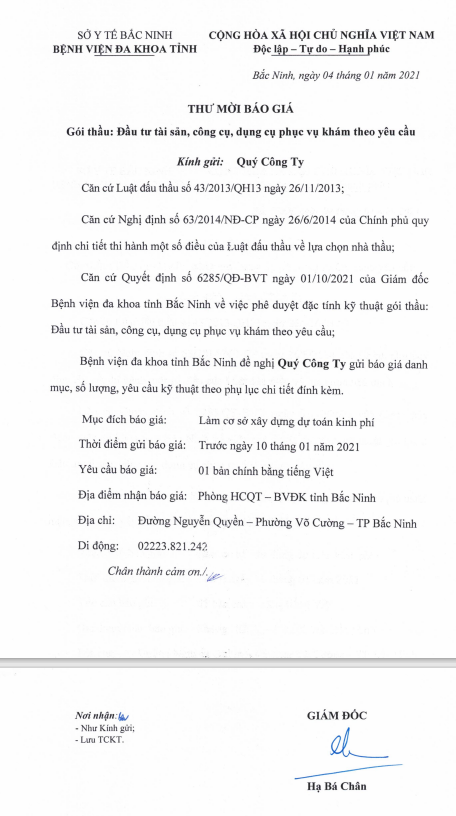 Thư mời báo giá Gói thầu: Đầu tư tài sản, công cụ, dụng cụ phục vụ khám theo yêu cầu