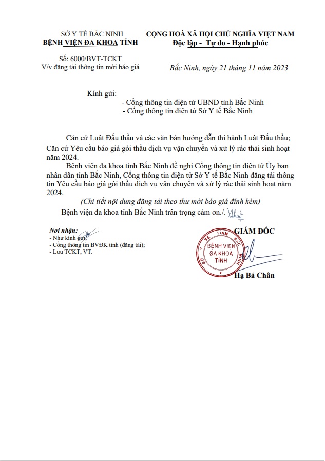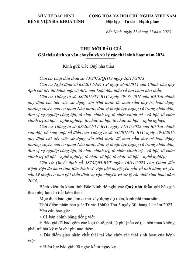 Thư mời báo giá Gói thầu dịch vụ chuyển và xử lý rác thải sinh hoạt năm 2024