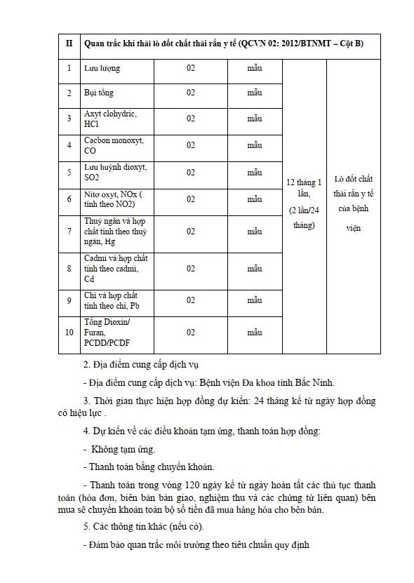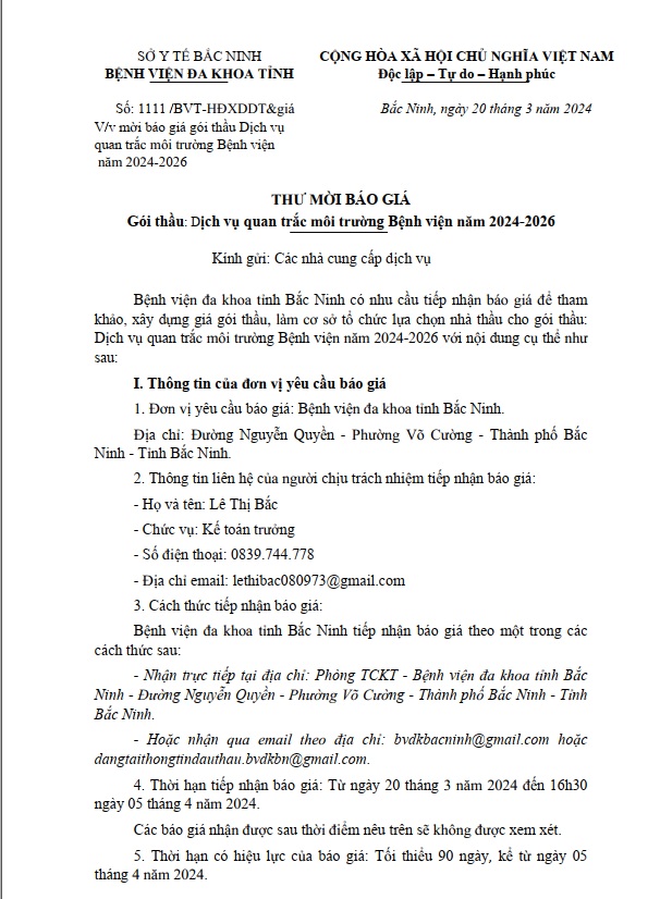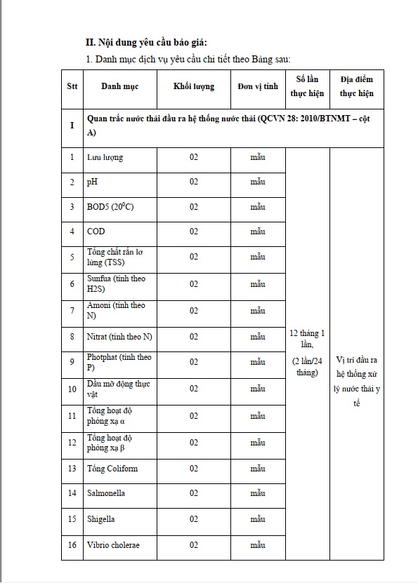Thư mời báo giá Gói thầu: Dịch vụ quan trắc môi trường Bệnh viện năm 2024-2026