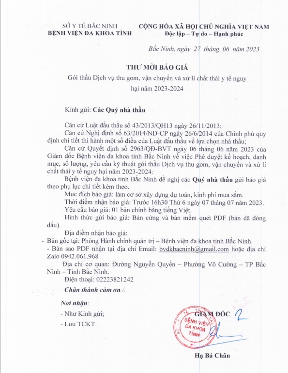 Thư mời báo giá Gói thầu Dịch vụ thu gom, vận chuyển và xử lý chất thải y tế nguy hại năm 2023-2024