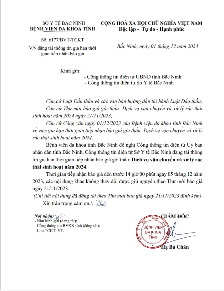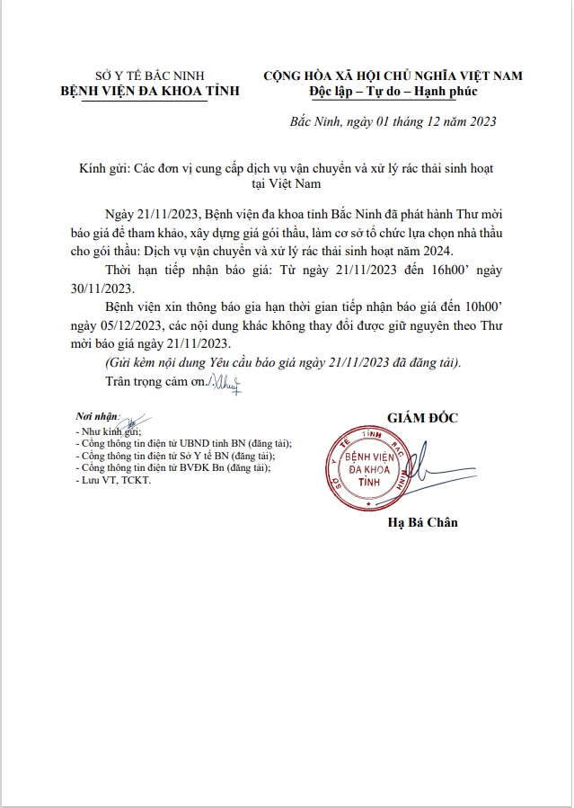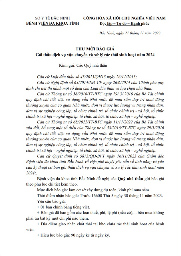 Thư mời báo giá Gói thầu dịch vụ vận chuyển và xử lý rác thải sinh hoạt năm 2024