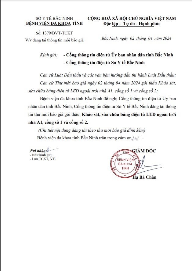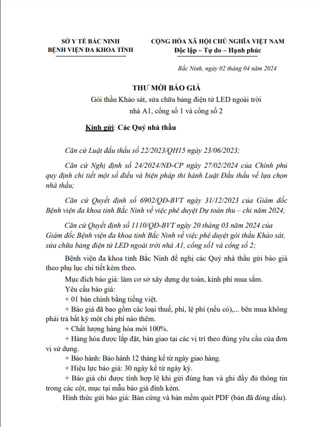 Thư mời báo giá Gói thầu Khảo sát, sửa chữa bảng điện tử LED ngoài trời nhà A1, cổng số 1 và cổng số 2